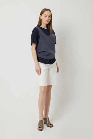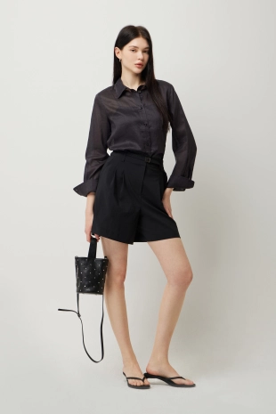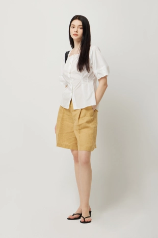 내추럴한 무드가 돋보이는 린넨 혼방 소재의 벨티드 숏 팬츠.