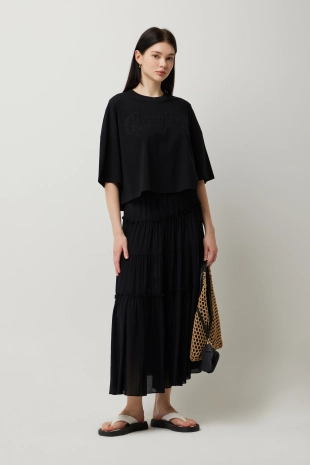크링클 소재로 시원한 터치감의 비스코스 소재로 제안된 레이어드형 슬릿 스커트.