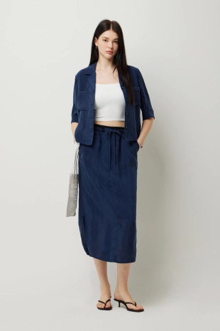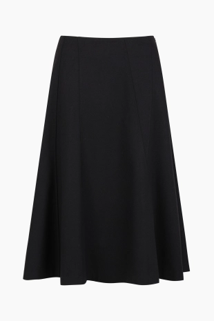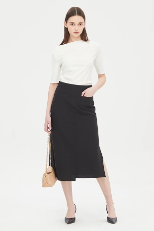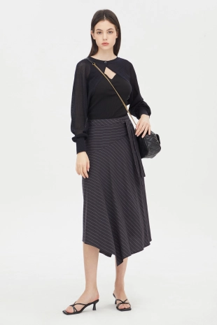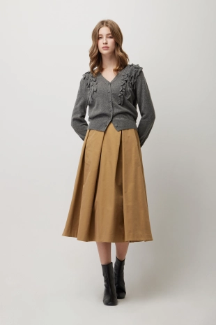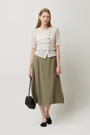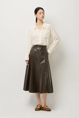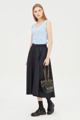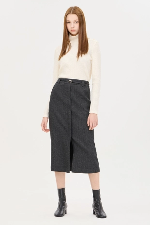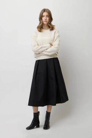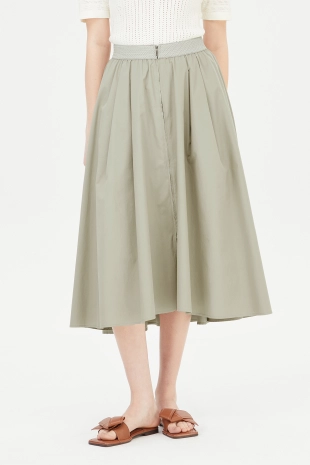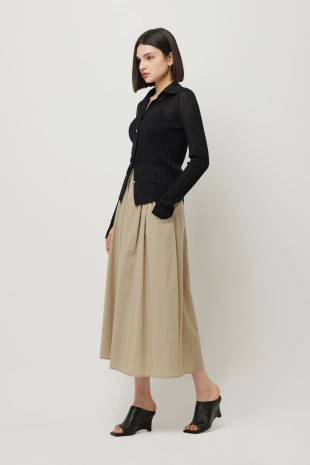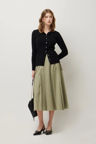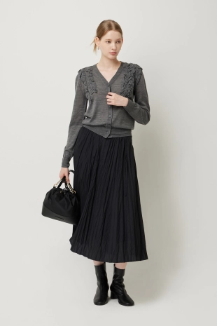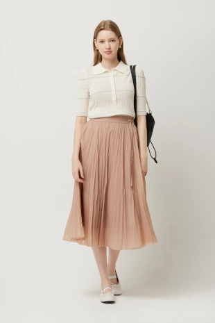 앞면의 플리츠 디테일과 뒷면의 플레어 실루엣 라인이 유니크한 롱 스커트.