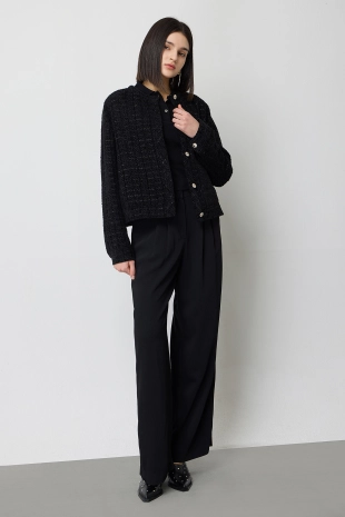 벨벳얀 소재에 은은한 메탈사가 믹스되어 화려한 무드로 포인트를 준 니트 가디건.