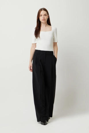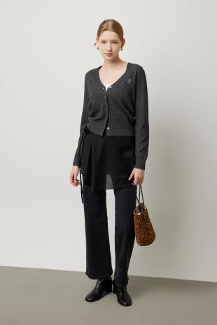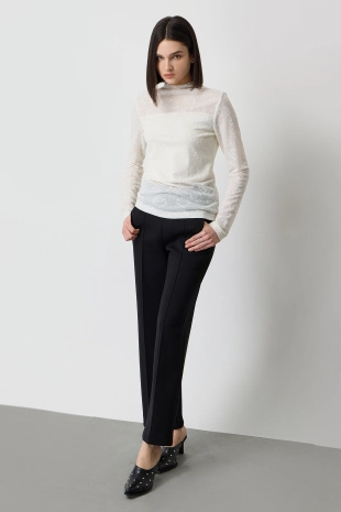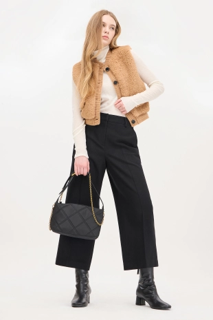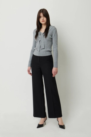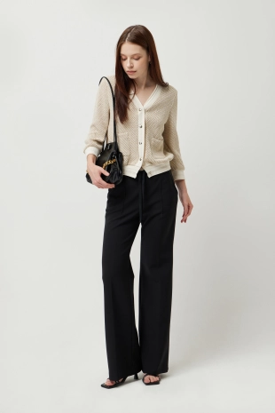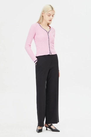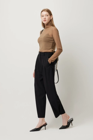 상단 사이드 비죠 장식으로 포인트를 준 슬랙스 팬츠.