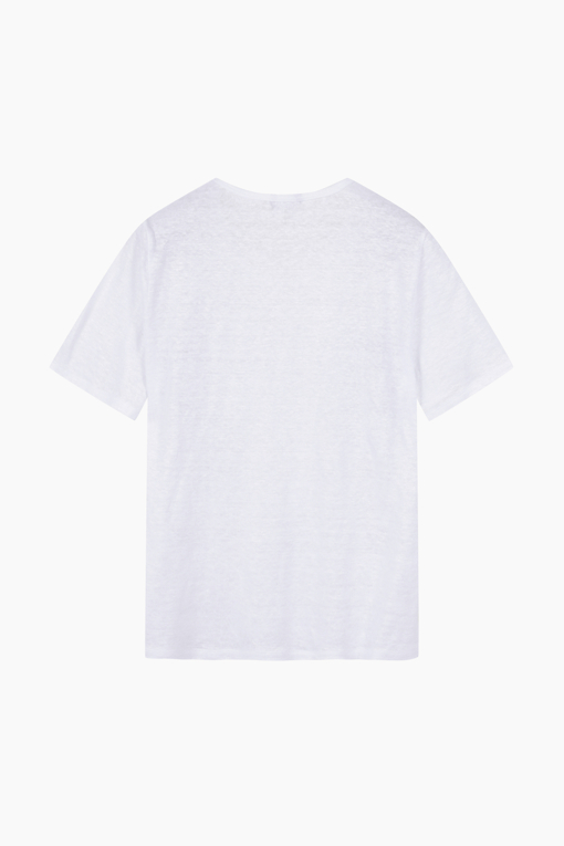 U넥라인의 미니포켓과 자수 디테일로 포인트를 준 린넥 티셔츠.