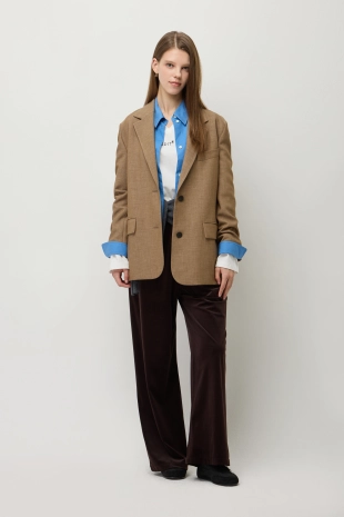 힙을 덮는 기장감의 소매 턴업 배색으로 포인트를 준 싱글 자켓.