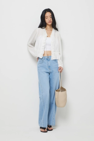 러플 디테일의 와이드한 훌 카라로 포인트를 준 반팔 블라우스.