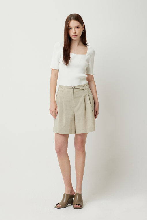심플한 실버 장식의 제천 벨트가 포인트인 투턱 숏 팬츠.