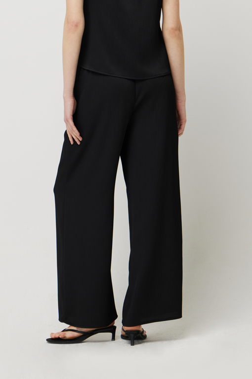 은은한 광택이있는 사틴 폴리 소재로 제안된 와이드 팬츠.