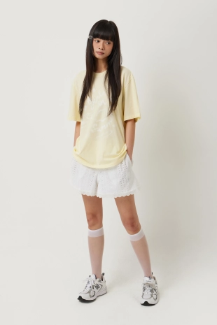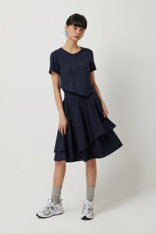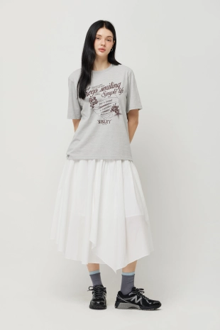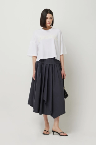 뒷면에 배색 덧장으로 유니크 디자인이 돋보이는 반팔 티셔츠.