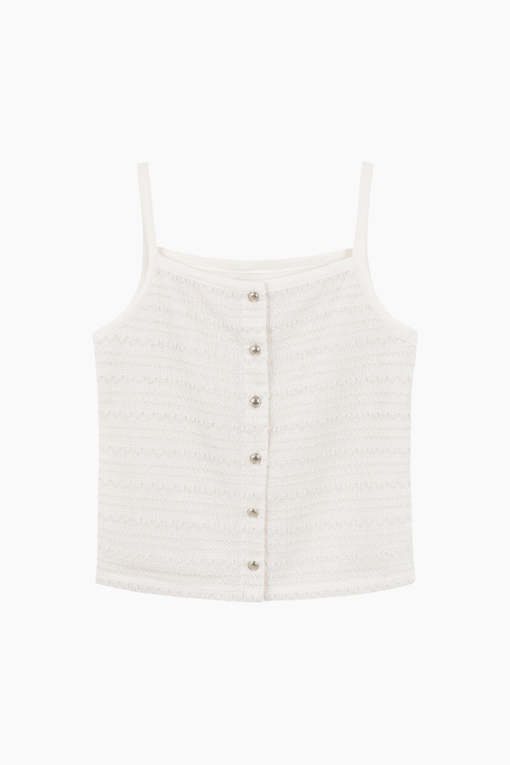 입체감있는 레이스 소재가 돋보이는 슬리브리스 블라우스.