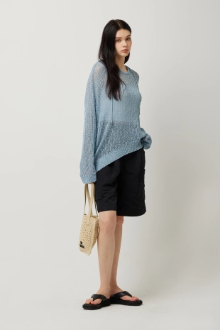 사이드 셔링 디테일로 포인트를 준 라운드넥 반팔 티셔츠.