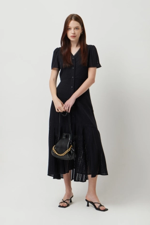 풍성한 소매와 유니크한 스커트 절개라인이 돋보이는 원피스.