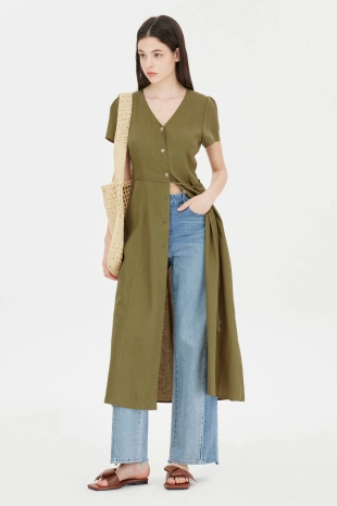 풀버튼 구조가 돋보이는 반팔 원피스.