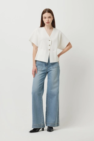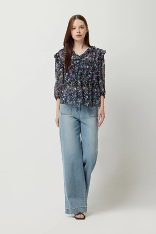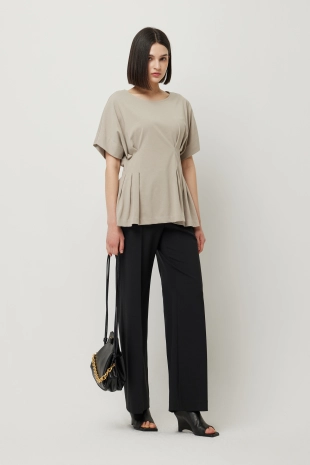 오프숄더로도 연출이 가능한 밴딩 셔링 브이넥 볼륨 블라우스.