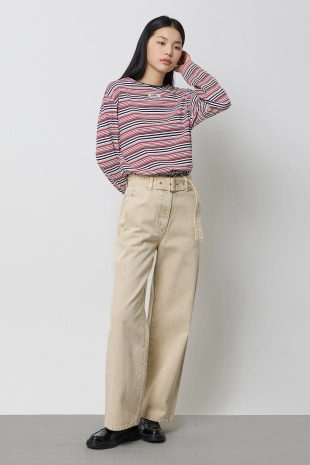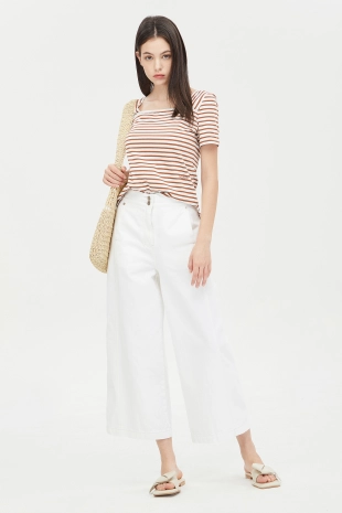 멀티 컬러 스트라이프 패턴의 슬림핏 라운드넥 반팔 티셔츠.