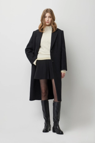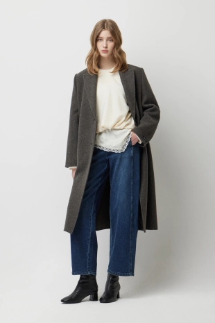 후크와 내부 버튼 여밈으로 심플한 외관을 선보이는 코트.