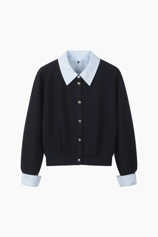 이중의 와이드한 겹 카라 쉐입이 돋보이는 가디건.
