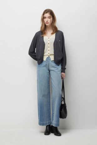 브이넥 카라에 버튼 여밈으로 심플하고 깔끔한 디자인을 보여줌.