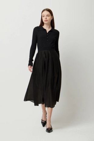 A라인으로 자연스럽게 주름지며 떨어지는 플레어 스커트 쉐입으로