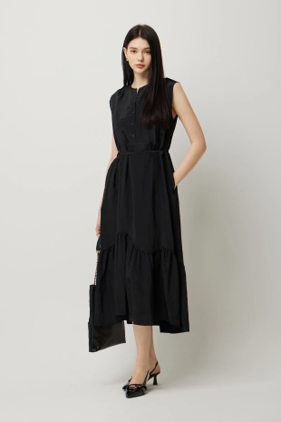 프릴을 더한 헨리넥 쉐입으로 여성스러운 넥 라인을 보여줌.