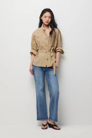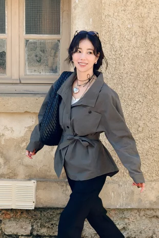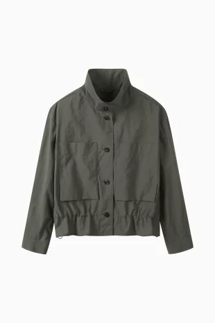 소매 끝단 스냅 버튼과 허리 스트링 내장으로 실루엣 조절이 가능함.