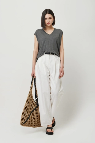 일자로 떨어지는 실루엣으로 심플하고 깔끔한 디자인을 보여줌.