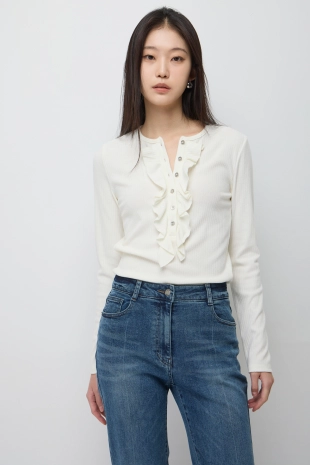 성근 짜임의 레이스 가디건으로 여성스러운 무드를 전함.