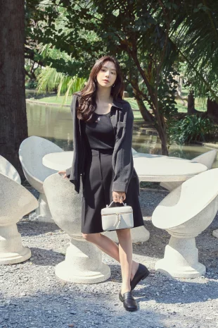원 턱 플리츠 디테일의 A라인으로 입체감있는 실루엣을 표현함.
