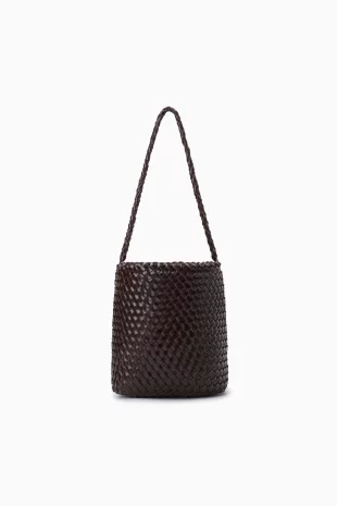 합성피혁을 섬세한 위빙 조직으로 제작한 버킷백.