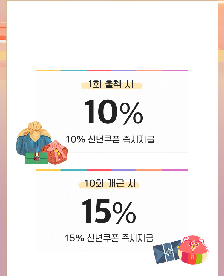- 15% 쿠폰은 10회 개근 시 즉시 지급되며, 유효기간은 1월 31일까지 입니다.
