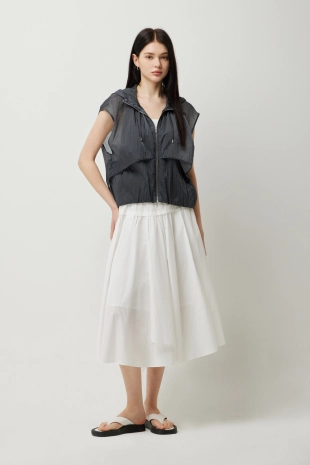 볼륨감있는 실루엣이 매력적인 베스트형 후드 집업 점퍼.