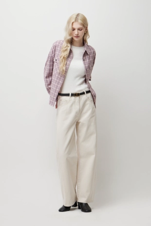 심플한 스탠 카라에 풀 버튼 구조로 단정함.