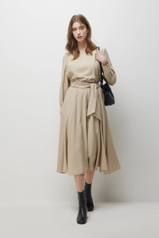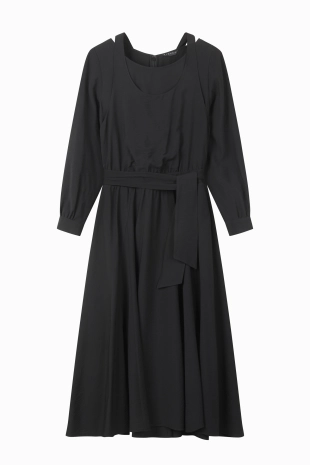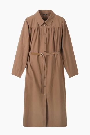 셔츠 형식에 플래킷 라인 훌 디테일로 우아한 무드를 더하는 원피스.